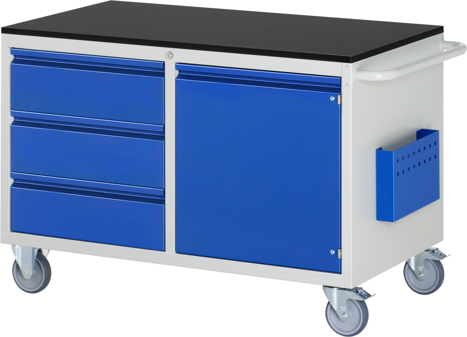 - Dokumententasche B325 x T55 x H200 mm an der rechten Seite angebracht. Vorderseite mit 4-Kant Systemlochung (Lochung 10x10 mm, Abstand Lochmitte-Lochmitte 38 mm) zur Aufnahme von Lochplatten-Zubehör.