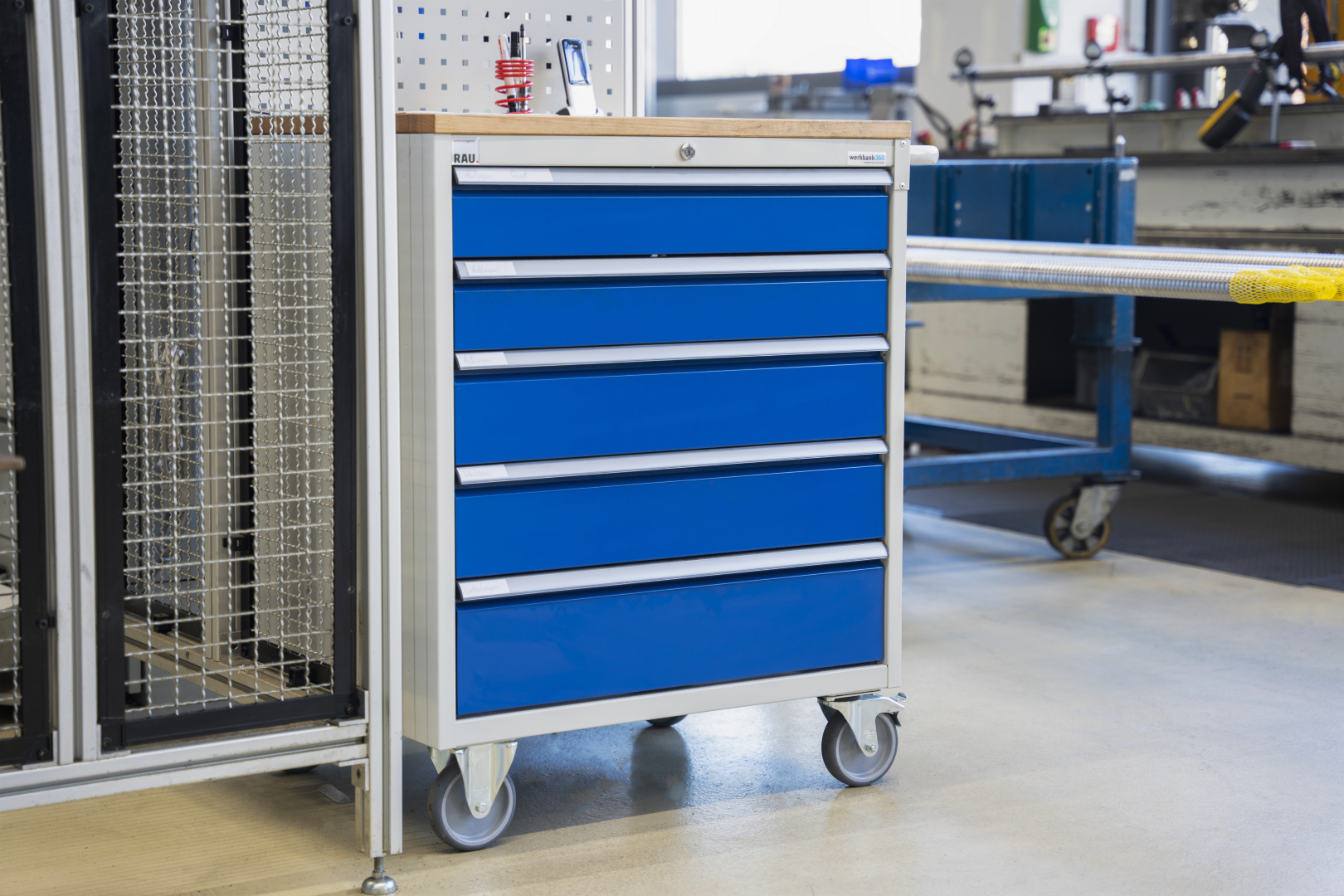 - 2 Bock- und 2 Lenkrollen mit Feststeller, jeweils montiert an angeschweißte Radplatten. Rollendurchmesser 125 mm, Bauhöhe 150 mm, Laufbelag aus thermoplastischem Gummi (grau, spurlos, 85° Shore), Radkörper aus Polypropylen. Bockrollen rechts: (vorne und hinten), Lenkrollen mit Feststeller links: (vorne und hinten) angebracht.