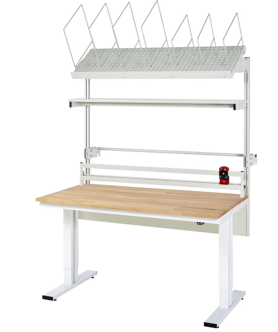 - 2 Doppelhubsäulen (80x50 mm, Prüfung gem. EN 60335-1) inkl. Steuereinheit und Anschlusskabel mit Stecker. Kufen aus Profil-Stahlrohr (100x30x3 mm) inkl. Nivellierfüßen. Kompletter Rahmen aus Profil-Stahlrohr (Stahlrohr 50x25x2,5 mm) oben unter der Arbeitsplatte. Bedienelement mit Auf-/Ab-Taster.