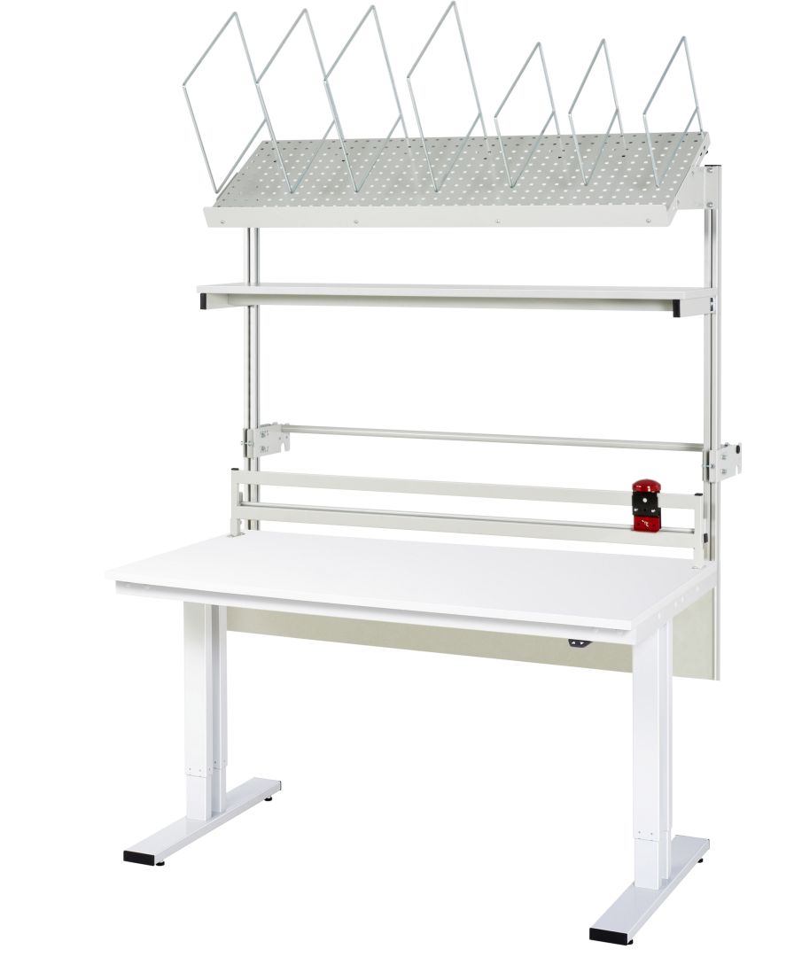 - Elektrische Verstellung mittels den 2 Doppelhubsäulen durch integrierten Linearantrieb. Geräuscharme, stufenlose und absolut synchrone Verstellung der Arbeitshöhe auch bei unsymmetrischer Belastung. Verstellweg 38 mm/s (ohne Zuladung). Einschaltdauer 10 % (6 Minuten pro Stunde oder 2 Minuten Dauerbetrieb bei Volllast). Stromverbrauch im Standby-Modus nur 0,1 W.