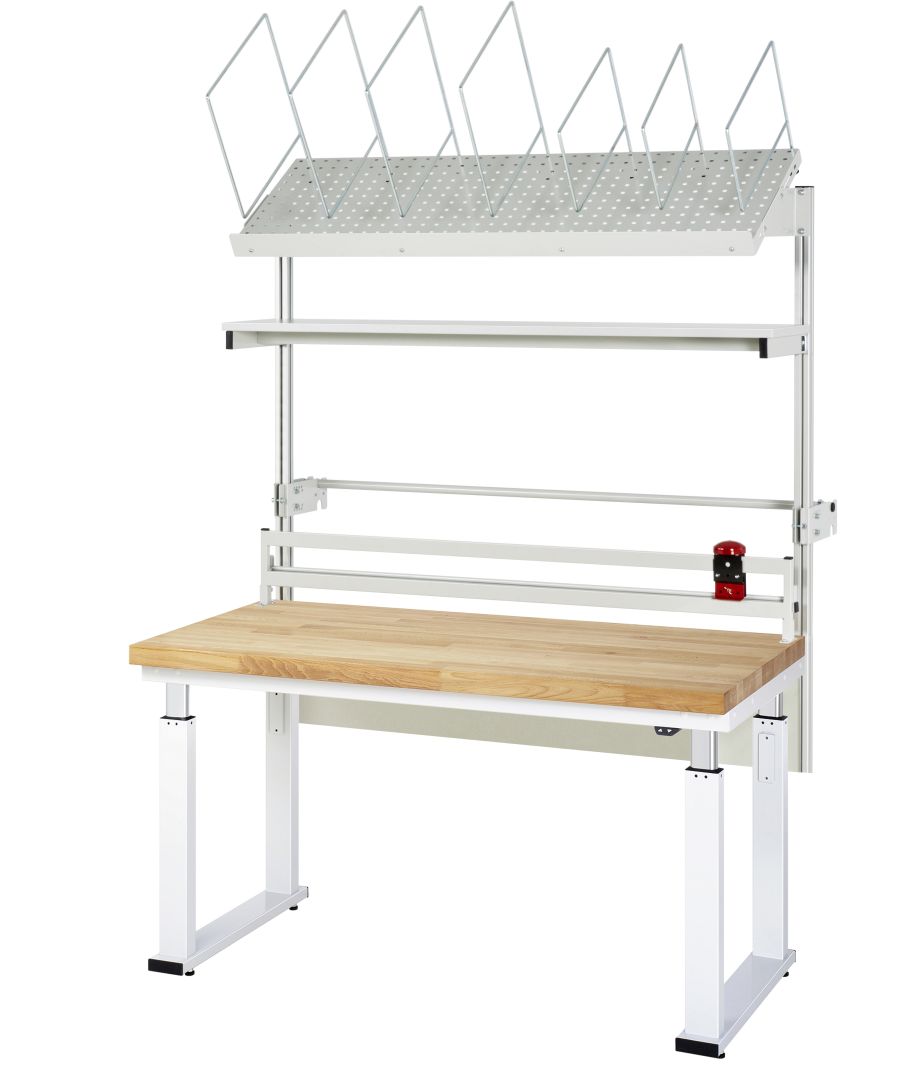 - 4 Hubsäulen (80x50 mm, Prüfung gem. EN 60335-1) inkl. Steuereinheit und Anschlusskabel mit Stecker. Kufen aus Profil-Stahlrohr (100x30x3 mm) inkl. Nivellierfüßen. Kompletter Rahmen aus Profil-Stahlrohr (Stahlrohr 50x25x2,5 mm) oben unter der Arbeitsplatte. Bedienelement mit Auf-/Ab-Taster.