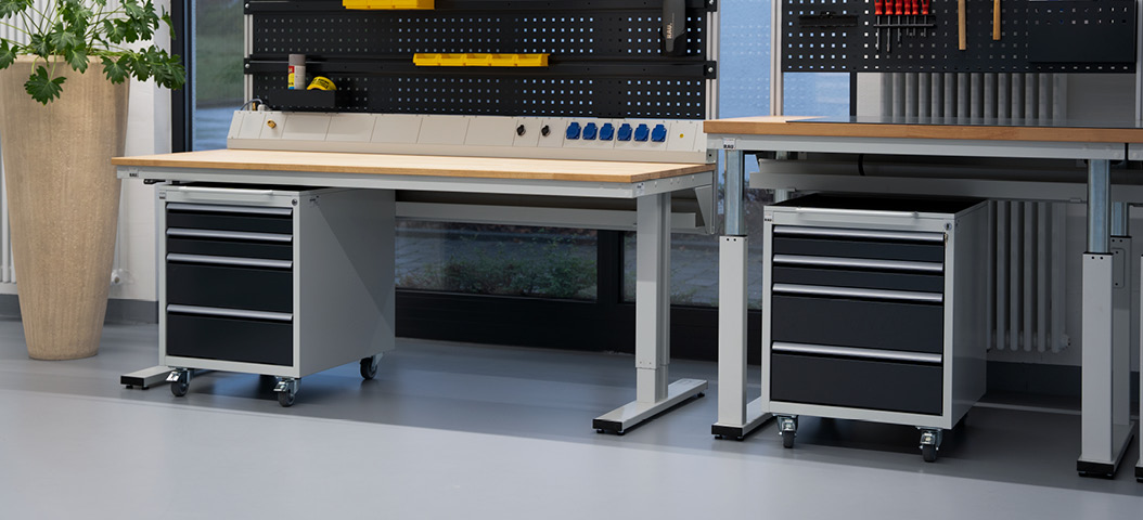 - Rollcontainer für Arbeitstische – ausgestattet mit stabilen Schubladenführungen, teilintegrierten Griffleisten und einem praktischen Schiebebügel.
