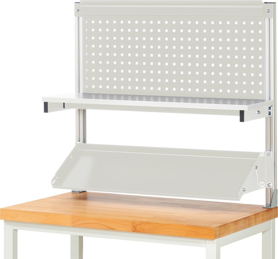 - Montage an: System-Stützen (dazwischen). Die Einbauhöhe ist stufenlos wählbar. Bei Montage einer Lochplatte können davor oder dahinter die Anbauelemente Etagenbord, Metallablage und Halteschiene montiert werden.