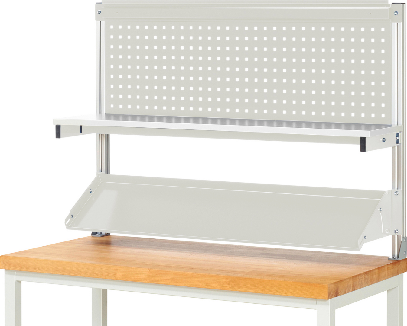 - Montage an: System-Stützen (dazwischen). Die Einbauhöhe ist stufenlos wählbar. Bei Montage einer Lochplatte können davor oder dahinter die Anbauelemente Etagenbord, Metallablage und Halteschiene montiert werden.