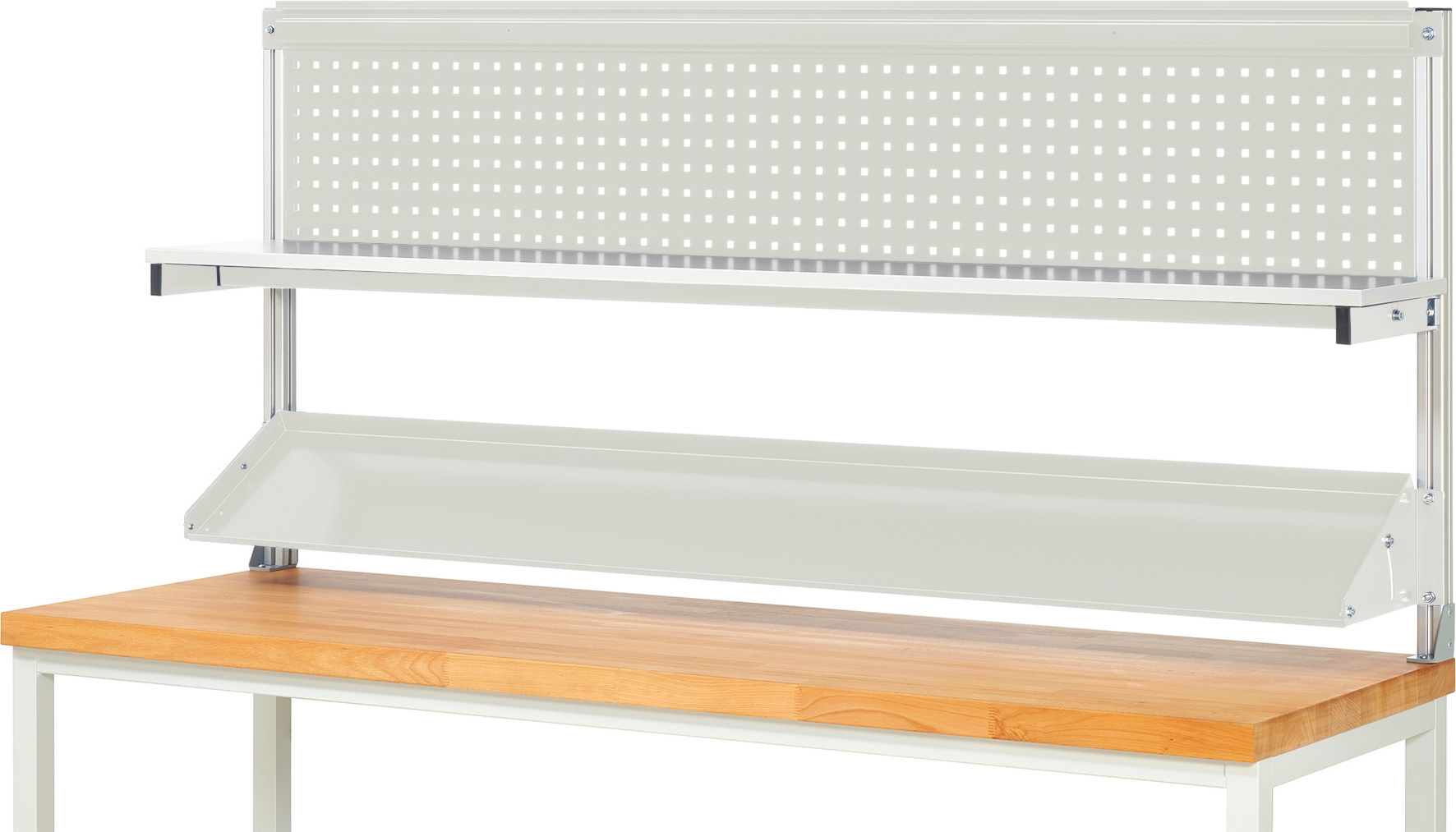 - Montage an: System-Stützen von vorne, System-Stützen von hinten. Die Einbauhöhe ist stufenlos wählbar. Die Montage ist auch vor oder hinter einer Lochplatte möglich. Bei zusätzlicher Verwendung einer Halteschiene kann diese als hintere Anschlagleiste genutzt werden.