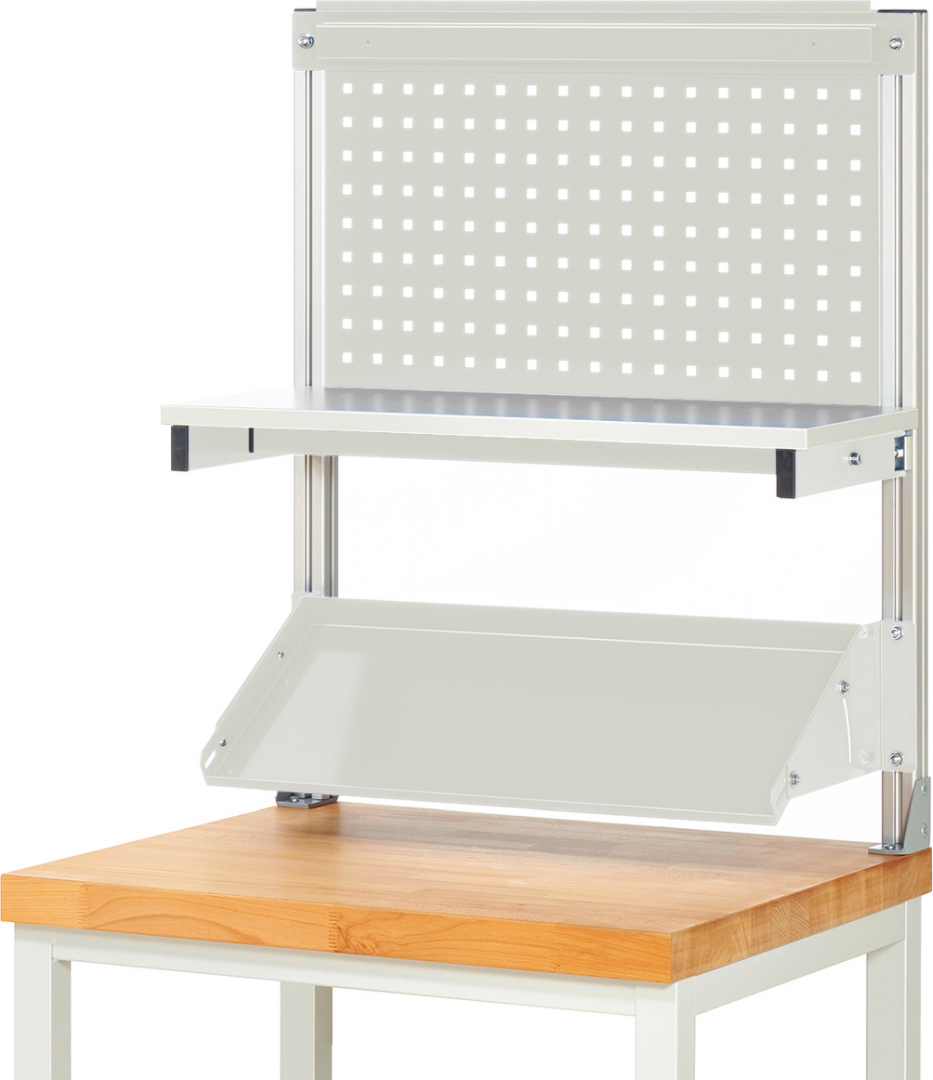 - Montage an: System-Stützen (dazwischen). Die Einbauhöhe ist stufenlos wählbar. Bei Montage einer Lochplatte können davor oder dahinter die Anbauelemente Etagenbord, Metallablage und Halteschiene montiert werden.