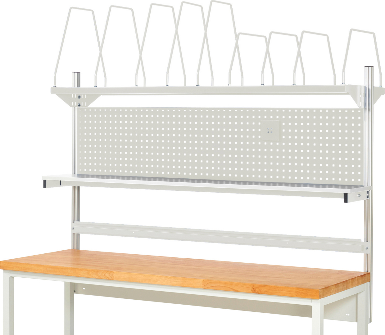 - 1 x Lochplatte B1915 x H450 mm mit 4-Kant Systemlochung (Lochung 10x10 mm, Abstand Lochmitte-Lochmitte 38 mm) zur Aufnahme von Lochplatten-Zubehör.