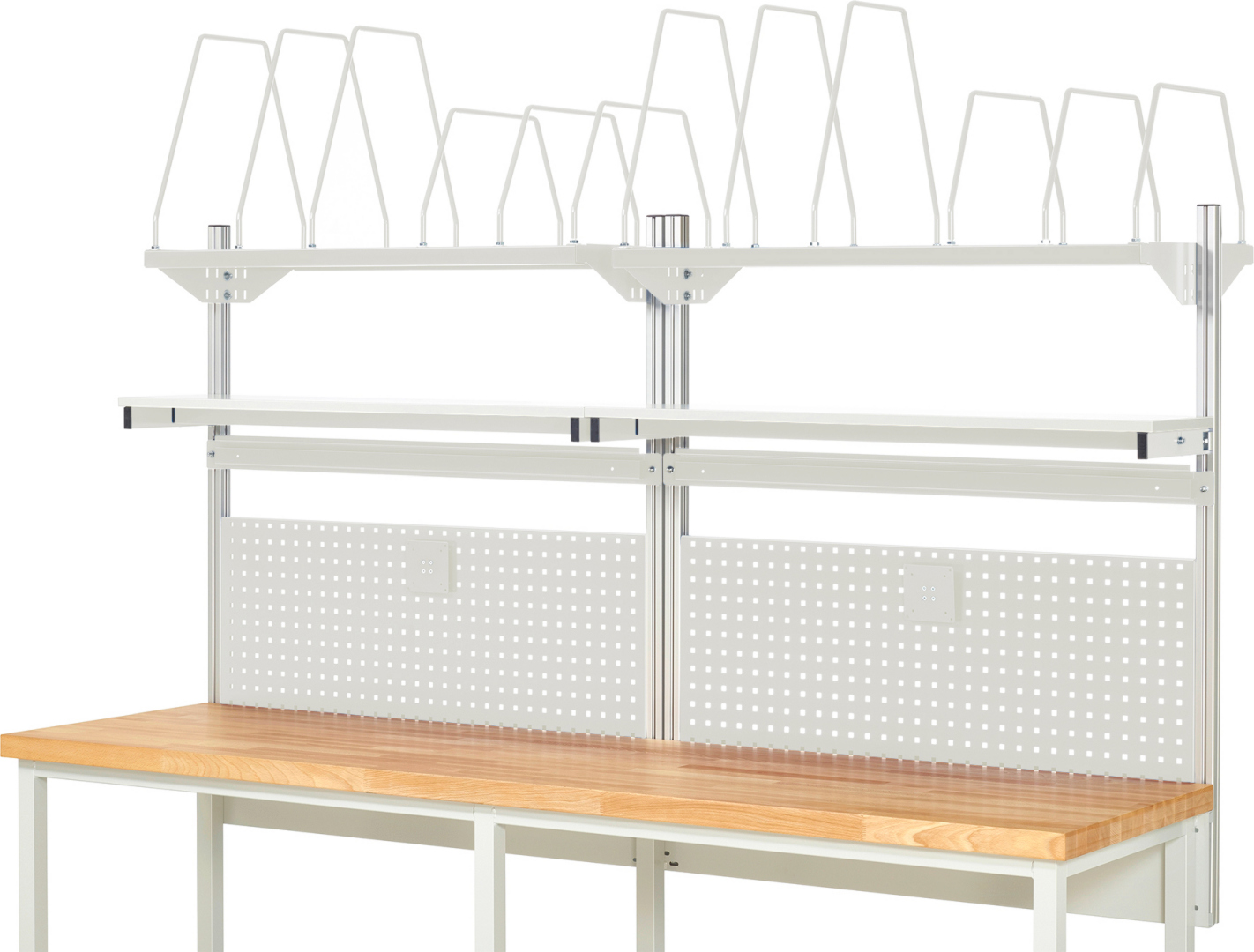- 2 x Lochplatte B1165 x H450 mm mit 4-Kant Systemlochung (Lochung 10x10 mm, Abstand Lochmitte-Lochmitte 38 mm) zur Aufnahme von Lochplatten-Zubehör.