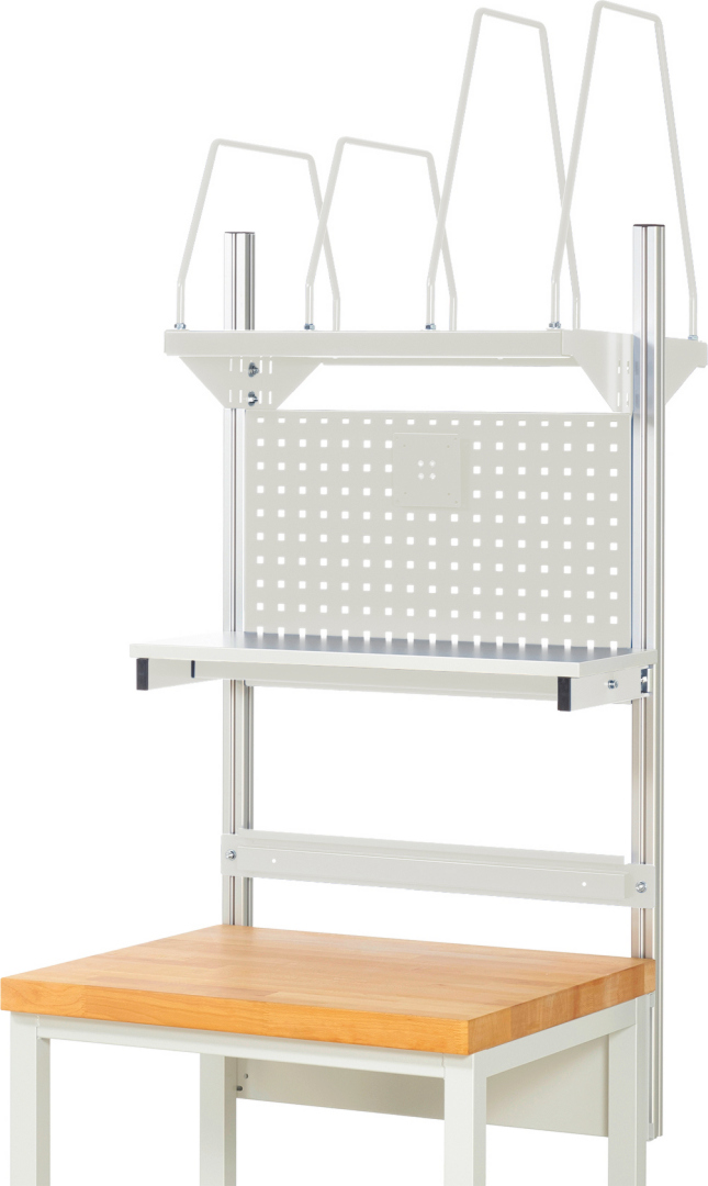 - 1 x Lochplatte B665 x H450 mm mit 4-Kant Systemlochung (Lochung 10x10 mm, Abstand Lochmitte-Lochmitte 38 mm) zur Aufnahme von Lochplatten-Zubehör.
