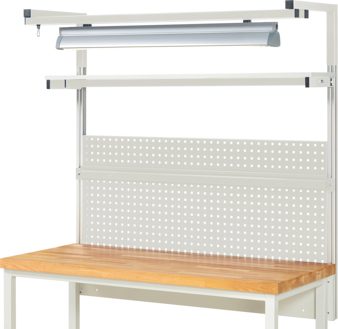 - 1 x Lochplatte B1415 x H650 mm mit 4-Kant Systemlochung (Lochung 10x10 mm, Abstand Lochmitte-Lochmitte 38 mm) zur Aufnahme von Lochplatten-Zubehör.