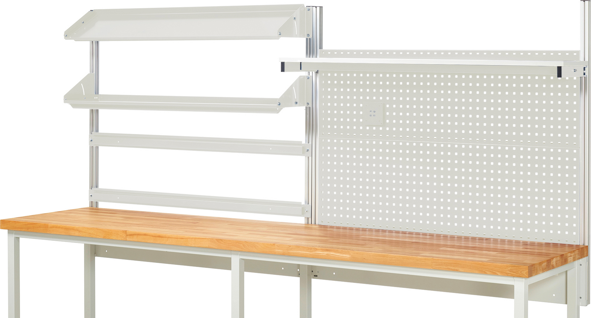 - 2 x Lochplatte B1415 x H450 mm mit 4-Kant Systemlochung (Lochung 10x10 mm, Abstand Lochmitte-Lochmitte 38 mm) zur Aufnahme von Lochplatten-Zubehör.
