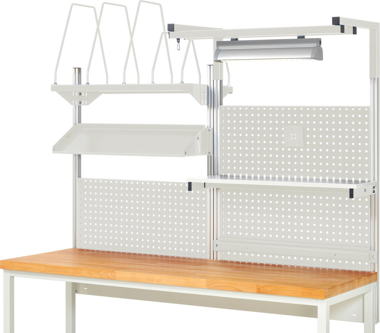 - 3 x Lochplatte B915 x H450 mm mit 4-Kant Systemlochung (Lochung 10x10 mm, Abstand Lochmitte-Lochmitte 38 mm) zur Aufnahme von Lochplatten-Zubehör.