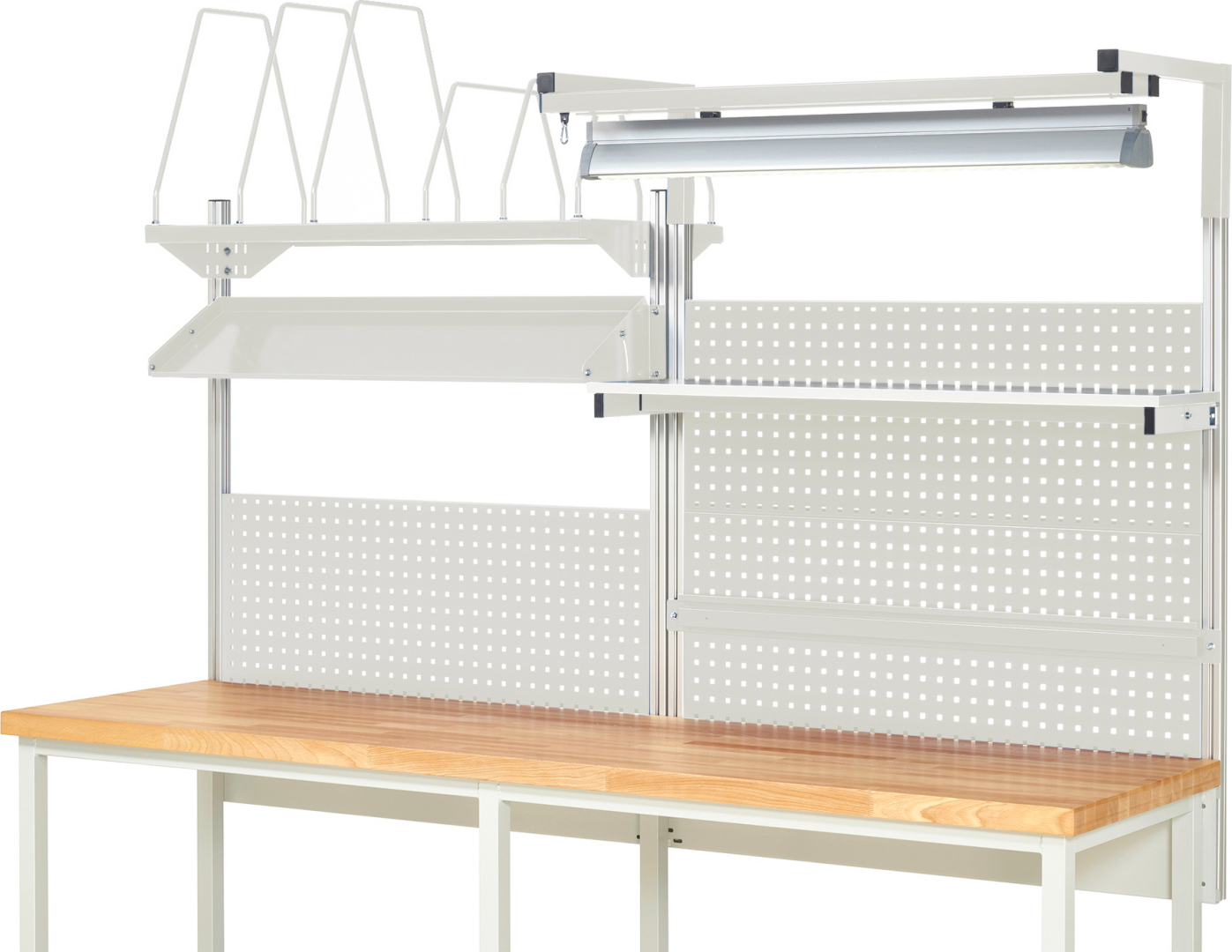 - 3 x Lochplatte B1165 x H450 mm mit 4-Kant Systemlochung (Lochung 10x10 mm, Abstand Lochmitte-Lochmitte 38 mm) zur Aufnahme von Lochplatten-Zubehör.