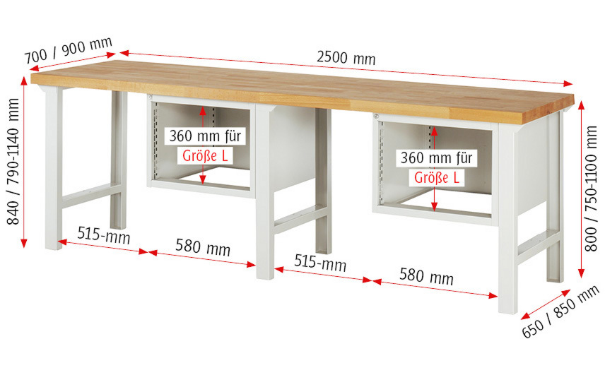 - Systemunterbau, B2500 x T650 x H800 mm.