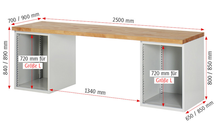 - Systemunterbau, B2500 x T650 x H800 mm.