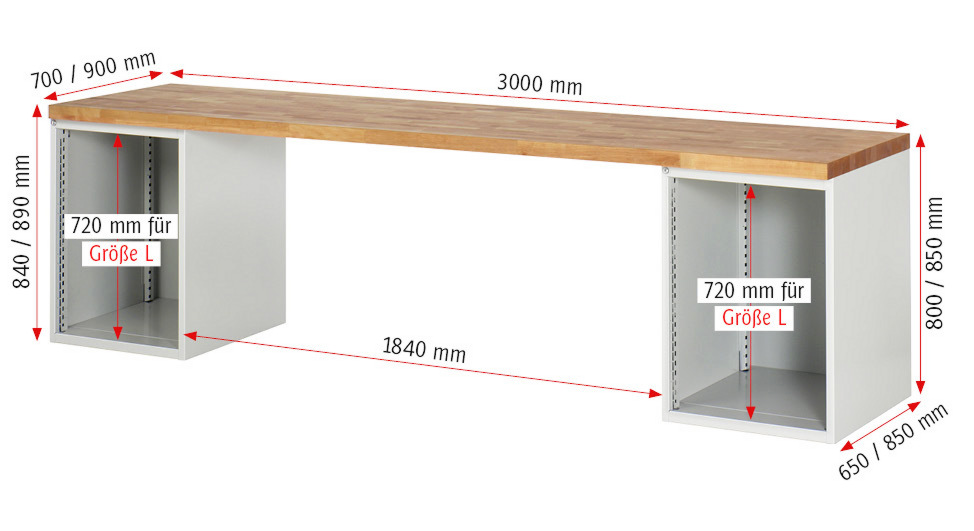 - Systemunterbau, B3000 x T650 x H800 mm.