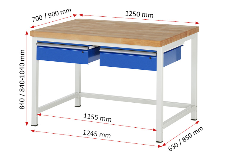 - 4-Fuß Schweißgestell mit zwei Gestellfußpaaren aus Profil-Stahlrohr (45x45x2 mm) inkl. Tiefenverstrebungen (oben und unten). Gestellfüße unten mit Abschlusselement inkl. Anti-Rutsch-Noppe für sicheren Stand. Querstreben aus C-Profil (40x40x2 mm) oben unter der Arbeitsplatte (vorne, hinten) sowie unten (hinten). Die Gestellfüße sind vorbereitet für die Aufnahme/Nachrüstung einer Höhenverstellung und/oder eines Rollensatzes.
