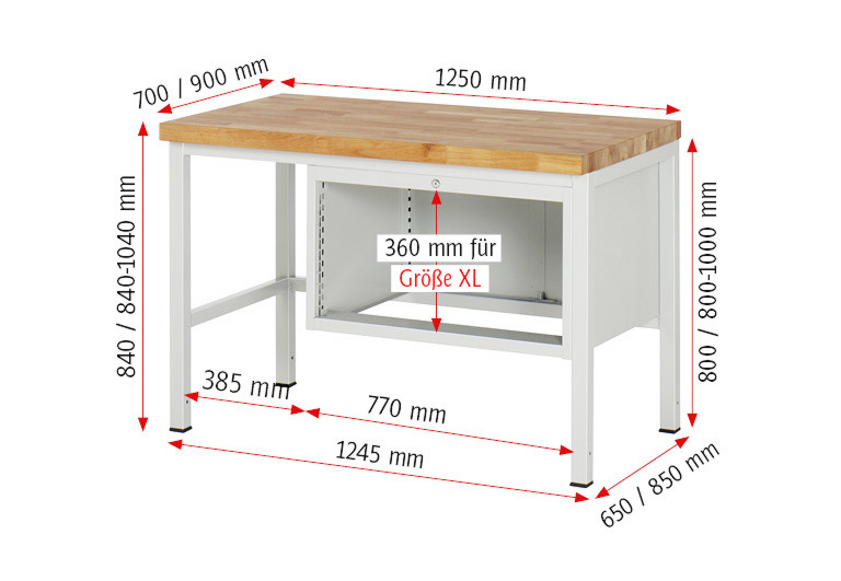 - 4-Fuß Schweißgestell mit zwei Gestellfußpaaren aus Profil-Stahlrohr (45x45x2 mm) inkl. Tiefenverstrebungen (oben und unten). Gestellfüße unten mit Abschlusselement inkl. Anti-Rutsch-Noppe für sicheren Stand. Querstreben aus C-Profil (40x40x2 mm) oben unter der Arbeitsplatte (vorne, hinten) sowie unten (hinten). Die Gestellfüße sind vorbereitet für die Aufnahme/Nachrüstung einer Höhenverstellung und/oder eines Rollensatzes.