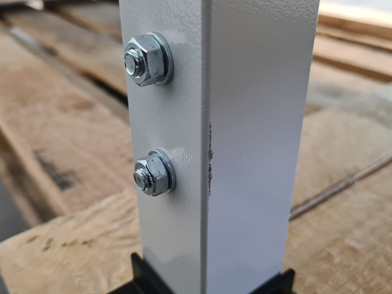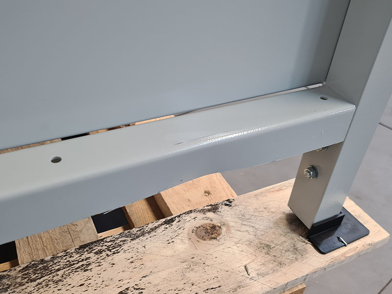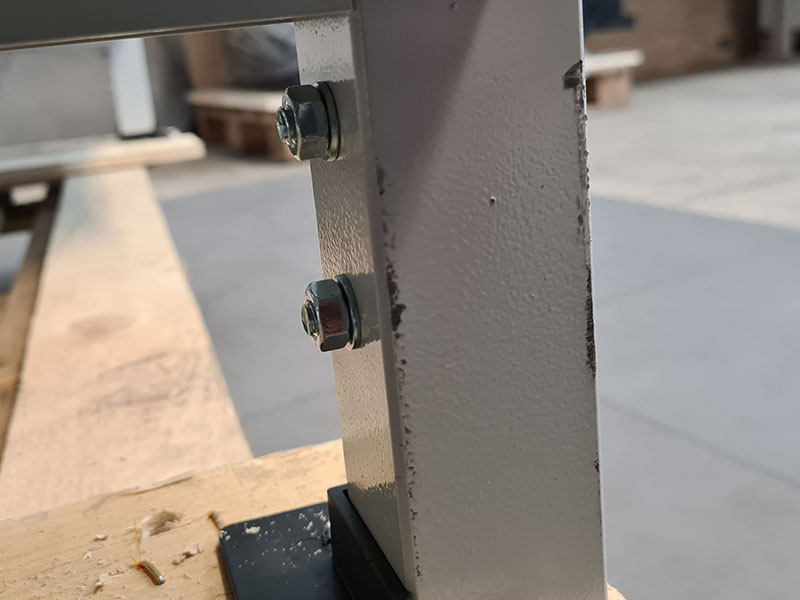 - 6-Fuß Schweißgestell mit drei Gestellfußpaaren aus Profil-Stahlrohr (45x45x2 mm) inkl. Tiefenverstrebungen (oben und unten). Gestellfüße unten mit integrierter Höhenverstellung/Höheneinstellung mittels Profil-Stahlrohr (40x40x2 mm) mit Lochraster (20 mm) sowie Abschlusselement inkl. Niveauausgleich und Anti-Rutsch-Noppe für sicheren Stand. Die Gestellfüße sind vorbereitet für die Aufnahme/Nachrüstung eines Rollensatzes.