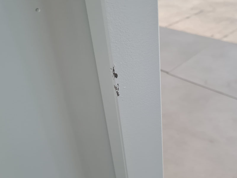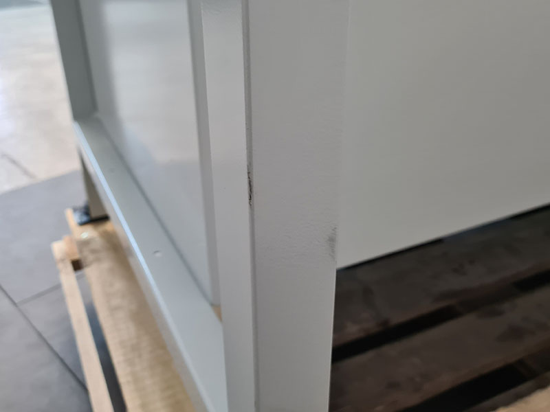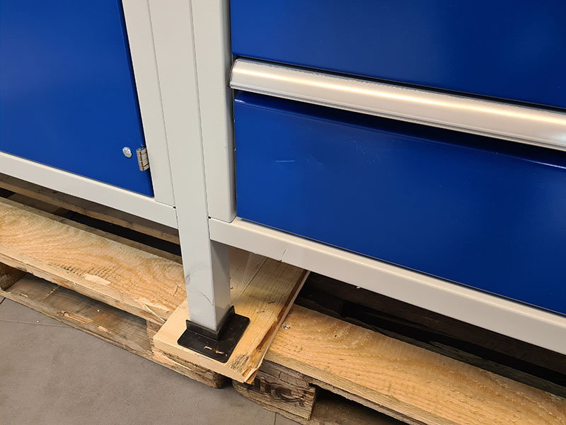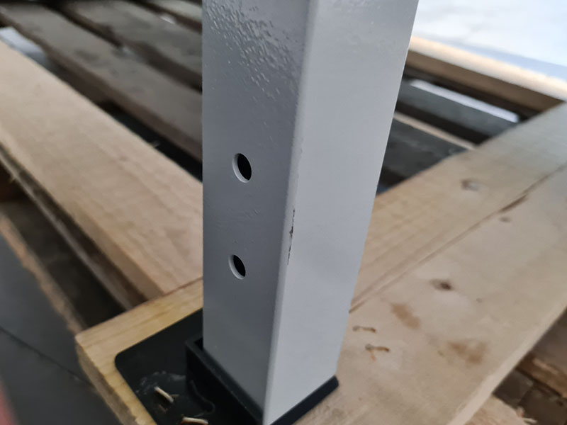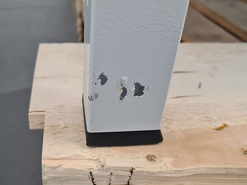 - 6-Fuß Schweißgestell mit drei Gestellfußpaaren aus Profil-Stahlrohr (45x45x2 mm) inkl. Tiefenverstrebungen (oben und unten). Gestellfüße unten mit Abschlusselement inkl. Anti-Rutsch-Noppe für sicheren Stand. Die Gestellfüße sind vorbereitet für die Aufnahme/Nachrüstung einer Höhenverstellung und/oder eines Rollensatzes.