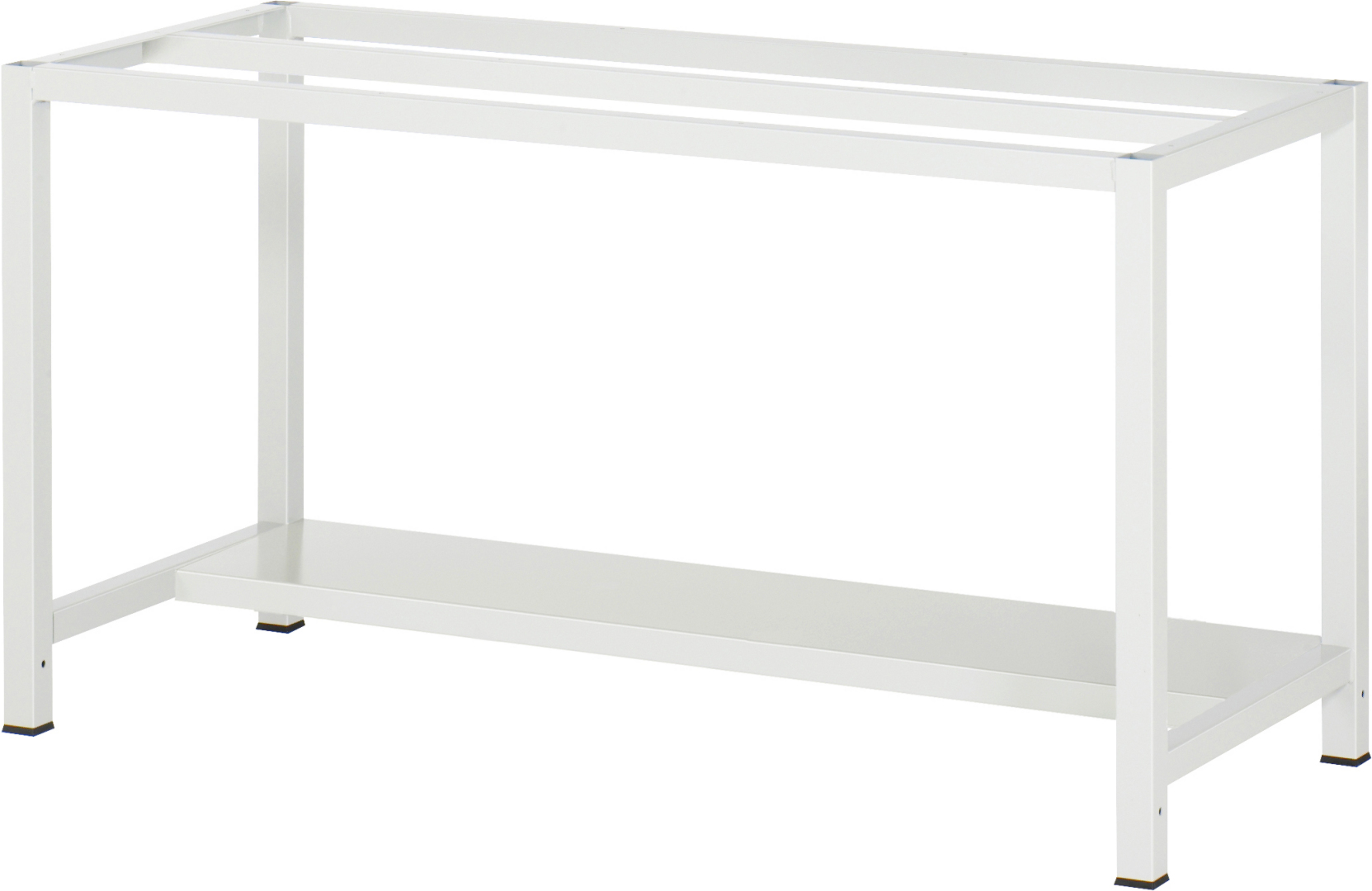 - 4-Fuß Schweißgestell mit zwei Gestellfußpaaren aus Profil-Stahlrohr (45x45x2 mm) inkl. Tiefenverstrebungen (oben und unten). Gestellfüße unten mit Abschlusselement inkl. Anti-Rutsch-Noppe für sicheren Stand. Querstreben aus C-Profil (40x40x2 mm) oben unter der Arbeitsplatte (vorne, mitte, hinten) sowie Ablageboden unten (Tiefe 320 mm, hinten bündig miTSystemunterbau, Fachhöhe 620 mm).