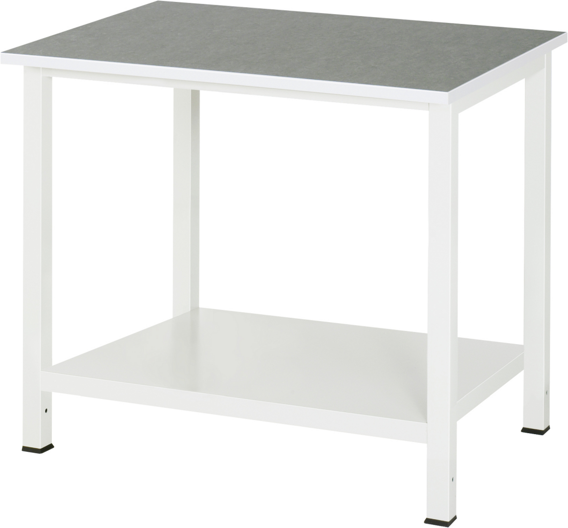 - Oberseite mit einem 2,0 mm starken, weichen und hellgrau marmoriertem Universal/Linoleum-Belag. Antistatisch, fungizid, bakteriostatisch, spritzwasserfest, schmutzresistent, temperaturbeständig. Weitgehend unempfindlich gegen Säuren, Öle, Fette, Lösungsmittel und Chemikalien. Empfindlich gegenüber Alkalien mit einem pH-Wert über 9 (z.B. Seife, Ammoniak). Belag schwer entflammbar (B1) nach DIN 4102. Plattenkern aus Spanplatte nach EN309 / EN312 (Emissionsklasse E1). Unterseite mit Gegenzug. Allseitig lichtgraue, antistatische ABS-Kante.
