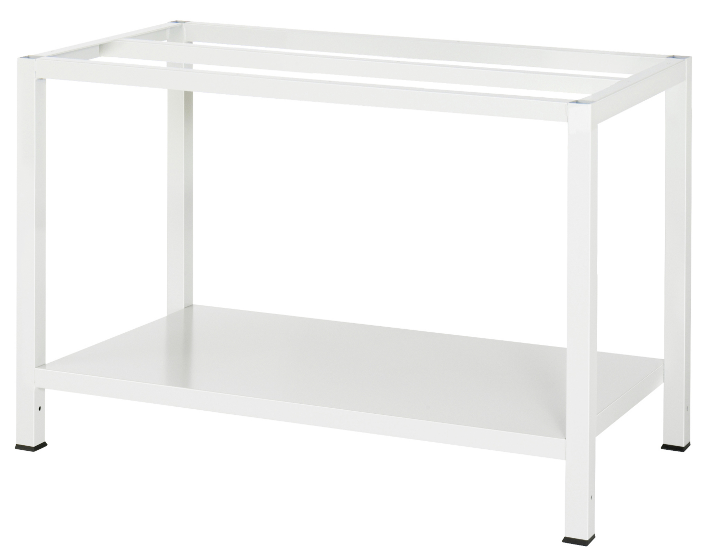 - 4-Fuß Schweißgestell mit zwei Gestellfußpaaren aus Profil-Stahlrohr (45x45x2 mm) inkl. Tiefenverstrebungen (oben und unten). Gestellfüße unten mit Abschlusselement inkl. Anti-Rutsch-Noppe für sicheren Stand. Querstreben aus C-Profil (40x40x2 mm) oben unter der Arbeitsplatte (vorne, mitte, hinten) sowie Ablageboden unten (Tiefe 650 mm hinten bündig miTSystemunterbau, Fachhöhe 620 mm).