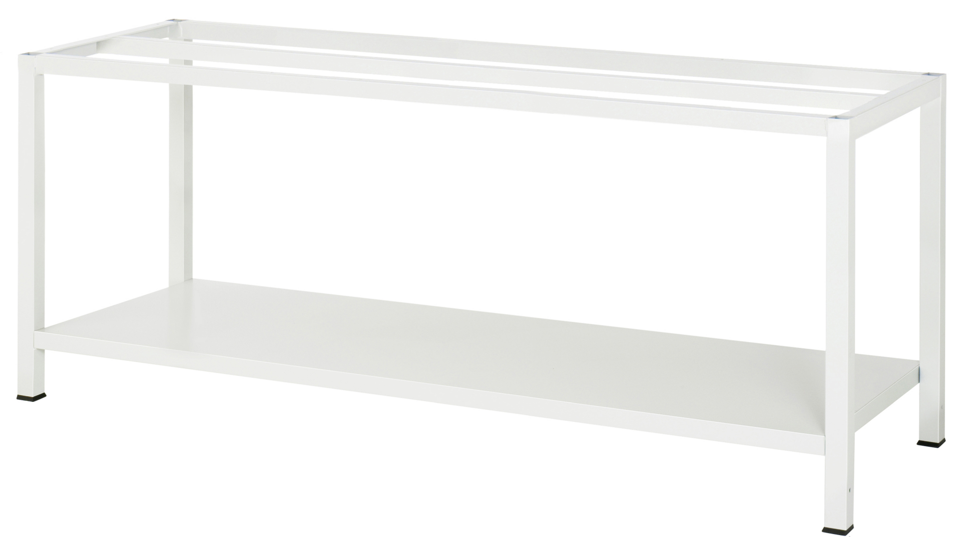 - 4-Fuß Schweißgestell mit zwei Gestellfußpaaren aus Profil-Stahlrohr (45x45x2 mm) inkl. Tiefenverstrebungen (oben und unten). Gestellfüße unten mit Abschlusselement inkl. Anti-Rutsch-Noppe für sicheren Stand. Querstreben aus C-Profil (40x40x2 mm) oben unter der Arbeitsplatte (vorne, mitte, hinten) sowie Ablageboden unten (Tiefe 650 mm hinten bündig miTSystemunterbau, Fachhöhe 620 mm).