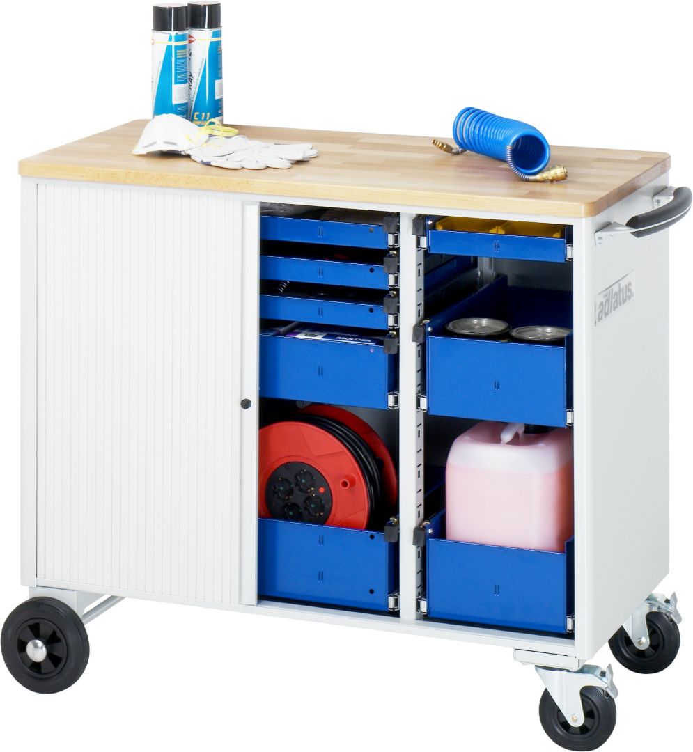 - Achse mit 2 Rädern (Überstand vorne und hinten jeweils 50 mm über den Basisschrank) an der linken Seite (Räderdurchmesser 160 mm) und 2 Lenkrollen mit Feststeller an der rechten Seite (Rollendurchmesser 100 mm, Bauhöhe 120 mm). Räder und Rollen mit Laufbelag aus thermoplastischem Gummi (grau, spurlos, 85° Shore), Radkörper aus Polypropylen.