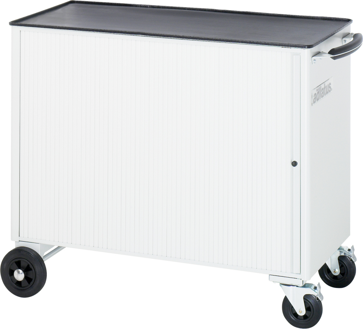 - Achse mit 2 Rädern (Überstand vorne und hinten jeweils 50 mm über den Basisschrank) an der linken Seite (Räderdurchmesser 160 mm) und 2 Lenkrollen mit Feststeller an der rechten Seite (Rollendurchmesser 100 mm, Bauhöhe 120 mm). Räder und Rollen mit Laufbelag aus thermoplastischem Gummi (grau, spurlos, 85° Shore), Radkörper aus Polypropylen.