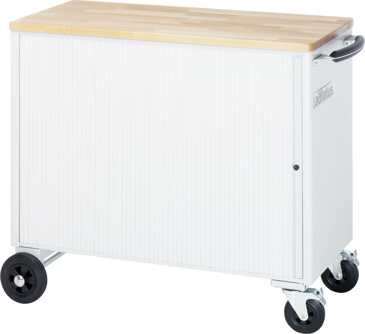 - Achse mit 2 Rädern (Überstand vorne und hinten jeweils 50 mm über den Basisschrank) an der linken Seite (Räderdurchmesser 160 mm) und 2 Lenkrollen mit Feststeller an der rechten Seite (Rollendurchmesser 100 mm, Bauhöhe 120 mm). Räder und Rollen mit Laufbelag aus thermoplastischem Gummi (grau, spurlos, 85° Shore), Radkörper aus Polypropylen.