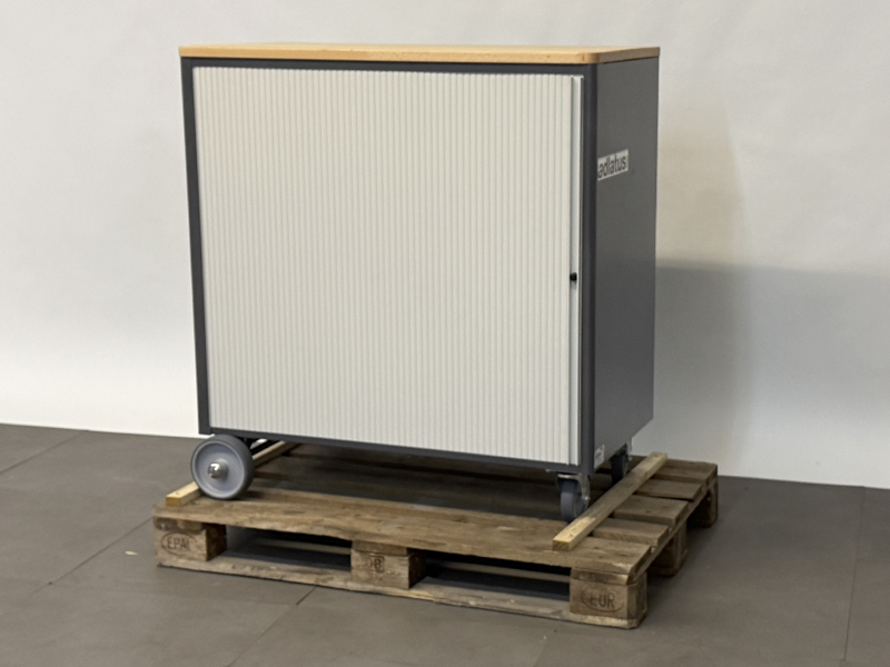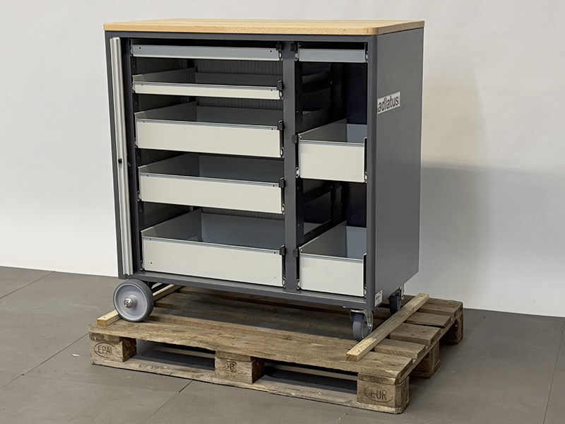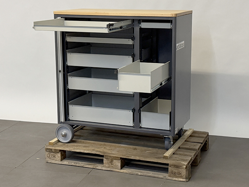 - Achse mit 2 Rädern (Überstand vorne und hinten jeweils 50 mm über den Basisschrank) an der linken Seite (Räderdurchmesser 160 mm) und 2 Lenkrollen mit Feststeller an der rechten Seite (Rollendurchmesser 100 mm, Bauhöhe 120 mm). Räder und Rollen mit Laufbelag aus thermoplastischem Gummi (grau, spurlos, 85° Shore), Radkörper aus Polypropylen.