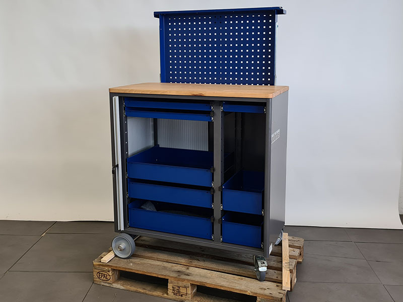 - Lochwand (B815 x H550 mm, abschließbar, einseitig bestückbar) fährt mittels Gasdruckfedern aus dem Gehäuse nach oben (Nutztiefe 70 mm). Mit 4-Kant Systemlochung (Lochung 10x10 mm, Abstand Lochmitte-Lochmitte 38 mm) zur Aufnahme von Lochplatten-Zubehör.
